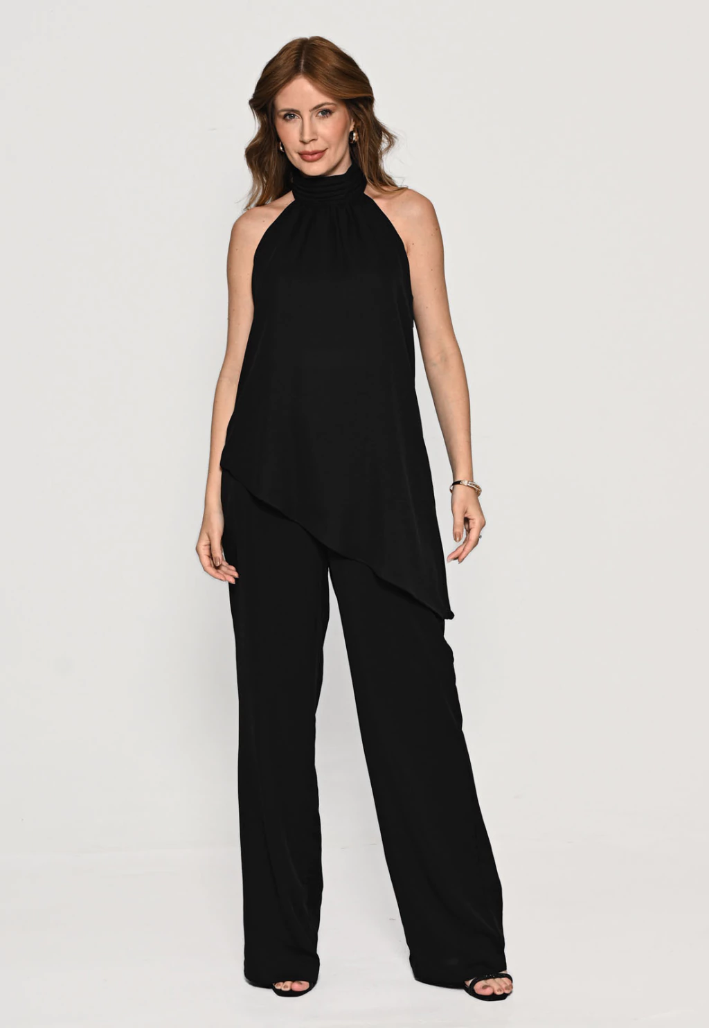 Calça Bisô Crepe Pantalona Preto. Peça confeccionada em crepe louise com fluidez e toque macio. Calça com bolsos modelo reto com zíper e cós elástico traseiro, peças forradas. Composição: 100% Poliéster/ Forro: 100% Poliéster