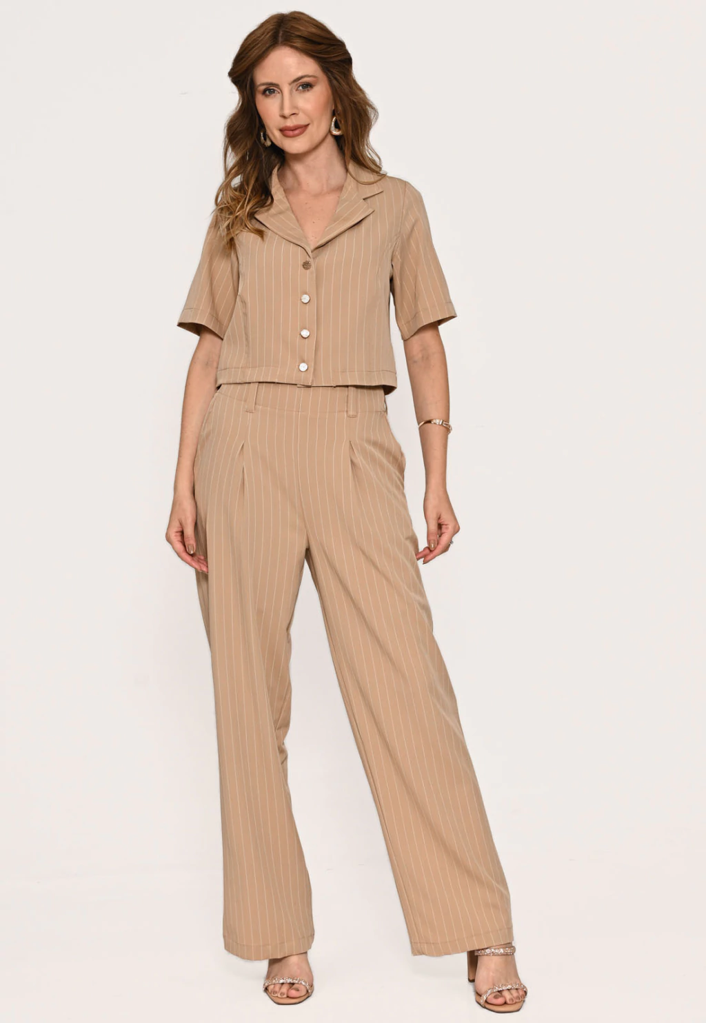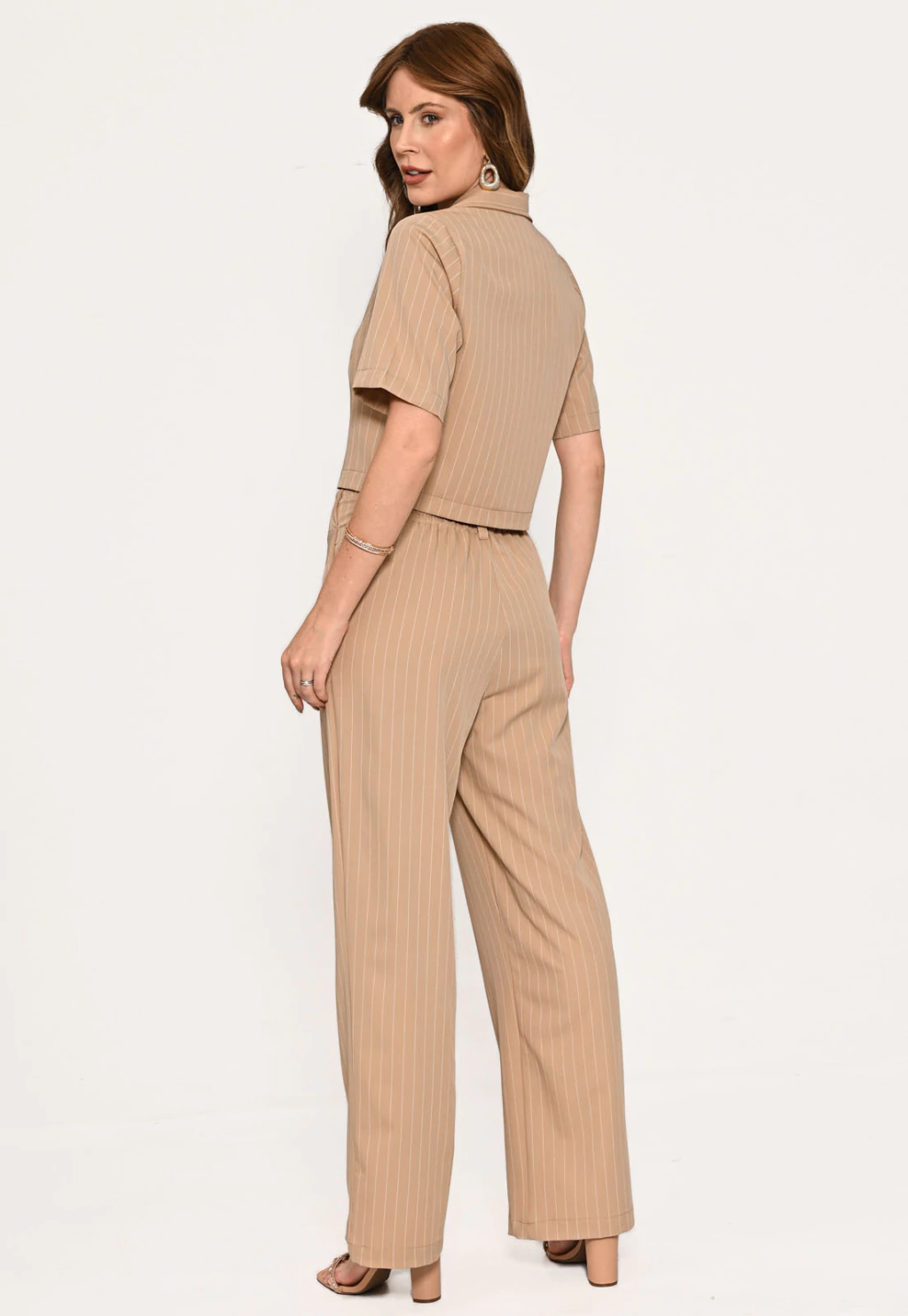 Calça Bisô Risca de Giz Alfaiataria Reta Bege. Peça confeccionada em tecido alfaiataria risca de giz fio tinto. Calça reta forrada com cós reto, elástico traseiro, zíper, bolsos laterais. Calça linda, estilosa e cheia de personalidade (camisa vendida separadamente). Composição: 100% Poliéster/ Forro:100% Poliéster
