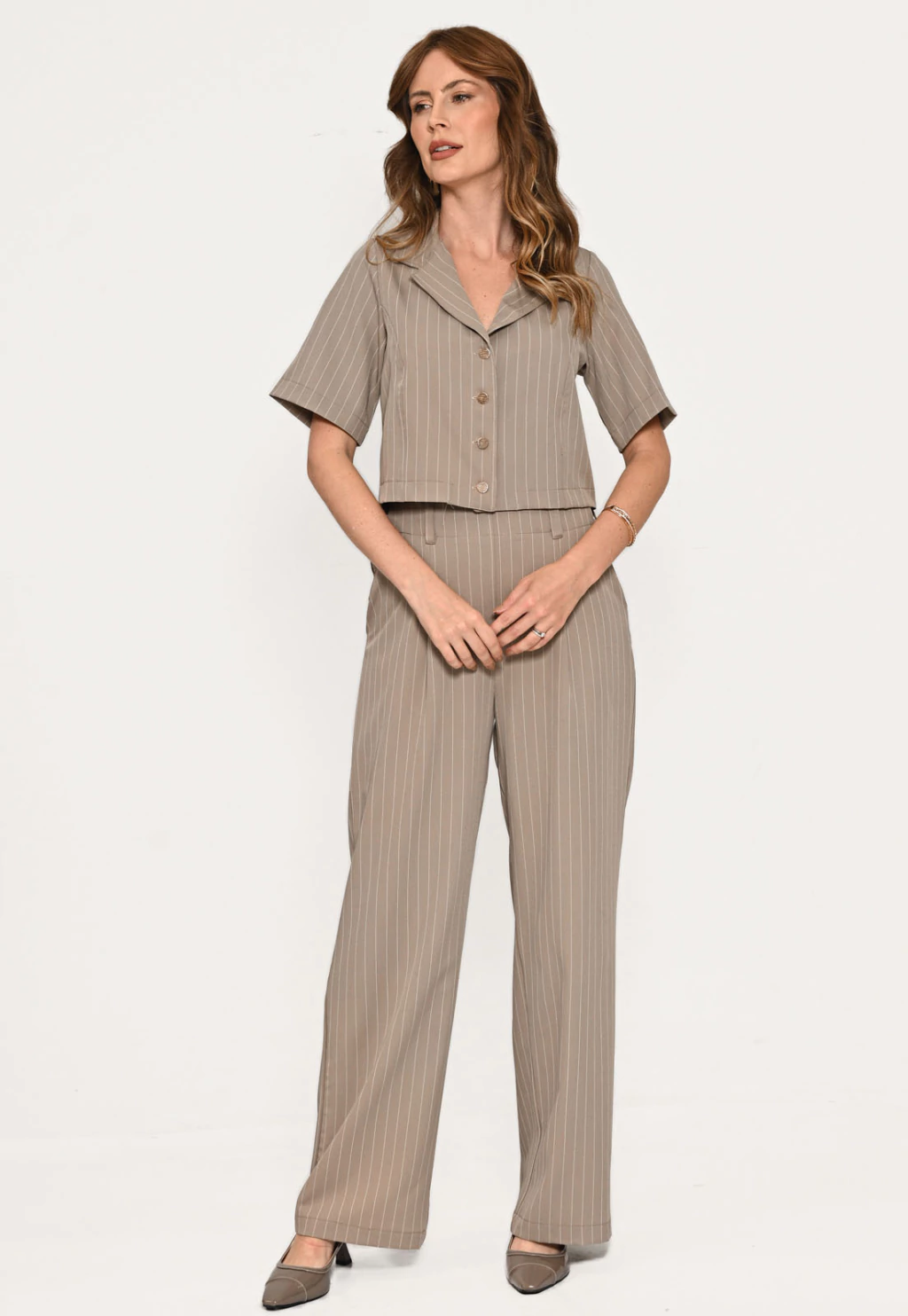 Calça Bisô Risca de Giz Alfaiataria Reta Cinza. Peça confeccionada em tecido alfaiataria risca de giz fio tinto. Calça reta forrada com cós reto, elástico traseiro, zíper, bolsos laterais. Calça linda, estilosa e cheia de personalidade (camisa vendida separadamente). Composição: 100% Poliéster/ Forro:100% Poliéster