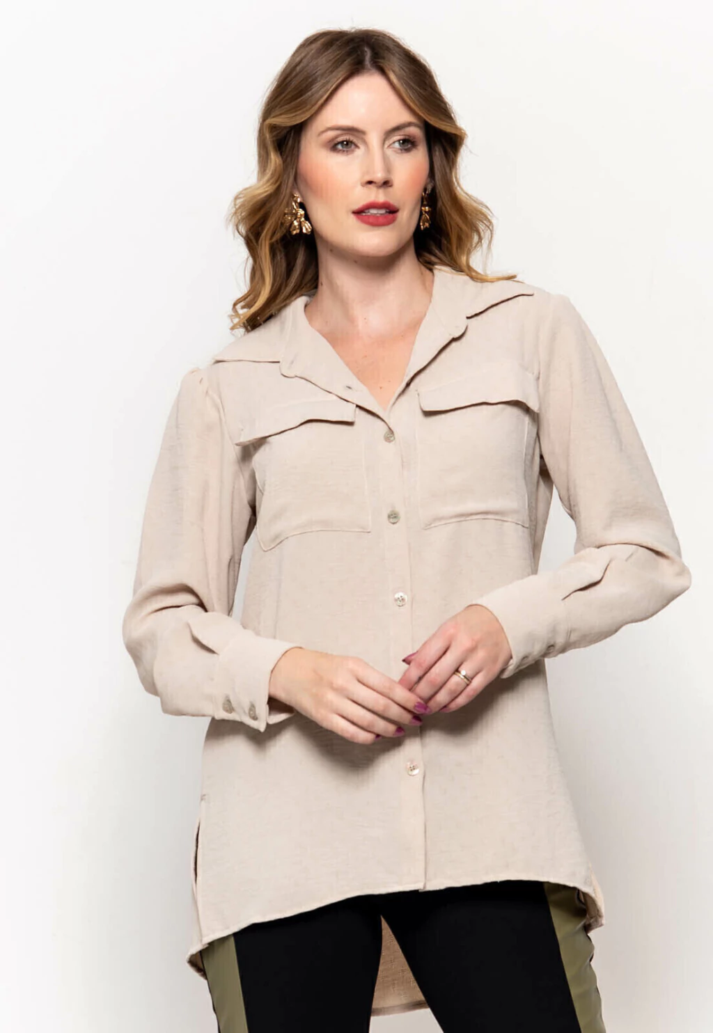 Camisa Bisô manga longa areia. Peça confeccionada em crepe liso com leve textura, manga longa com punho, dois bolsos frontais, abertura nas laterais. Composição: 100% Poliéster.