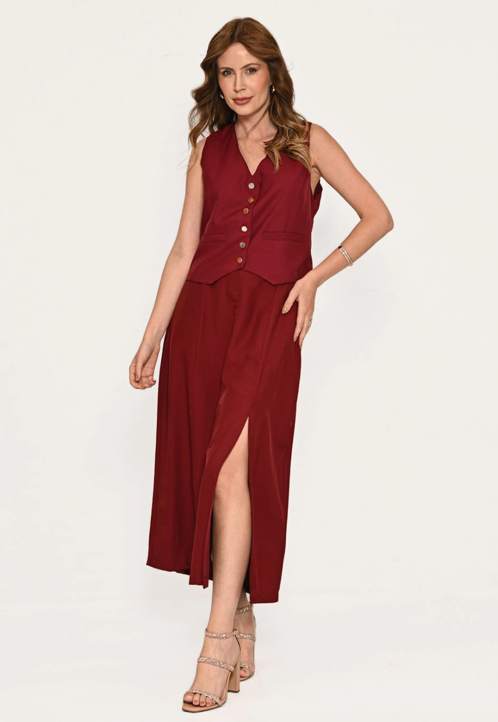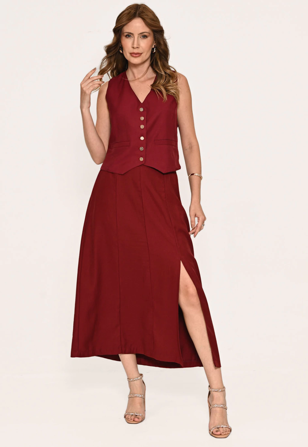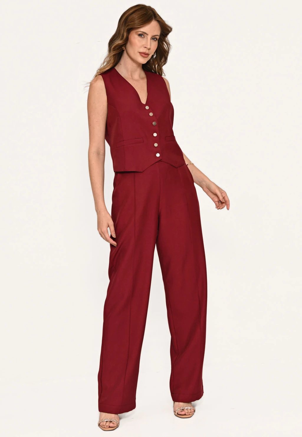 Colete Bisô Alfaiataria Marrant Vinho. Peça confeccionada em alfaiataria marrant, tecido com viscose na composição, colete com botões dourados, bolsinho falso e recortes para caimento perfeito. Use como blusa ou terceira peça e arrase nos looks. Composição: 90% Viscose/10% Poliéster/ Forro: 90% Viscose/10% Poliéster