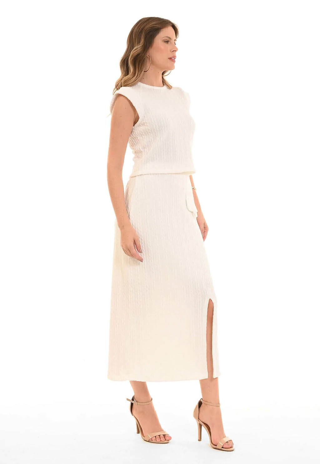 Conjunto Bisô Blusa e Saia Midi Fendas Off White. Peça confeccionada em malha tricô com desenhos em relevo. Blusa decote careca, manga curta, saia midi com recortes e fenda frontal, cós com elástico para maior conforto. Conjunto maravilhoso, atemporal e versátil. Composição: 99% Poliéster 1% Elastano.