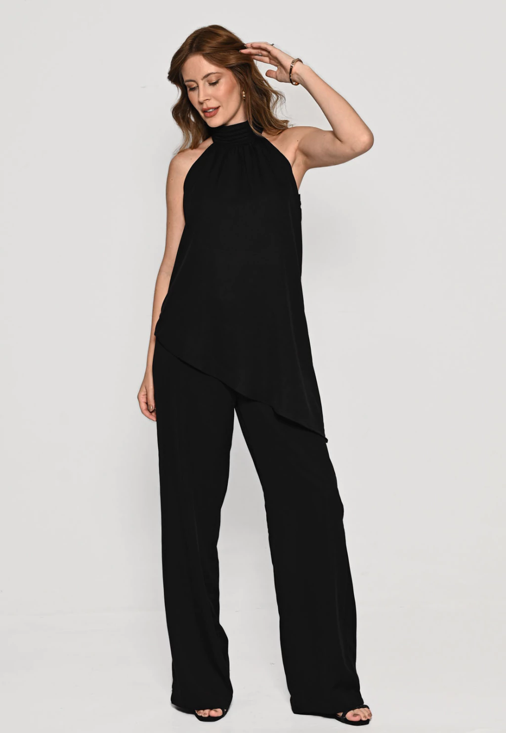 Conjunto Bisô Calça e Blusa Crepe Preto. Peças confeccionadas em crepe louise com fluidez e toque macio. Blusa assímetrica gola alta com pregas e fecho com botões, calça com bolsos modelo reto com zíper e cós elástico traseiro, peças forradas. Composição: 100% Poliéster/ Forro: 100% Poliéster