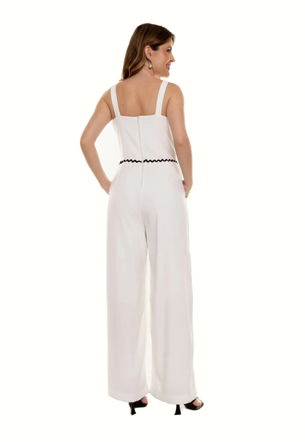 Macacão Bisô liso sianinha off white. Peça confeccionada em crepe alfaiataria prada encorpado, com detalhes de sianinha (fita ondulada) nos recortes , forrado , alças largas, zíper traseiro. Composição: 96% Poliéster 04% Elastano/ Forro 100% Poliéster