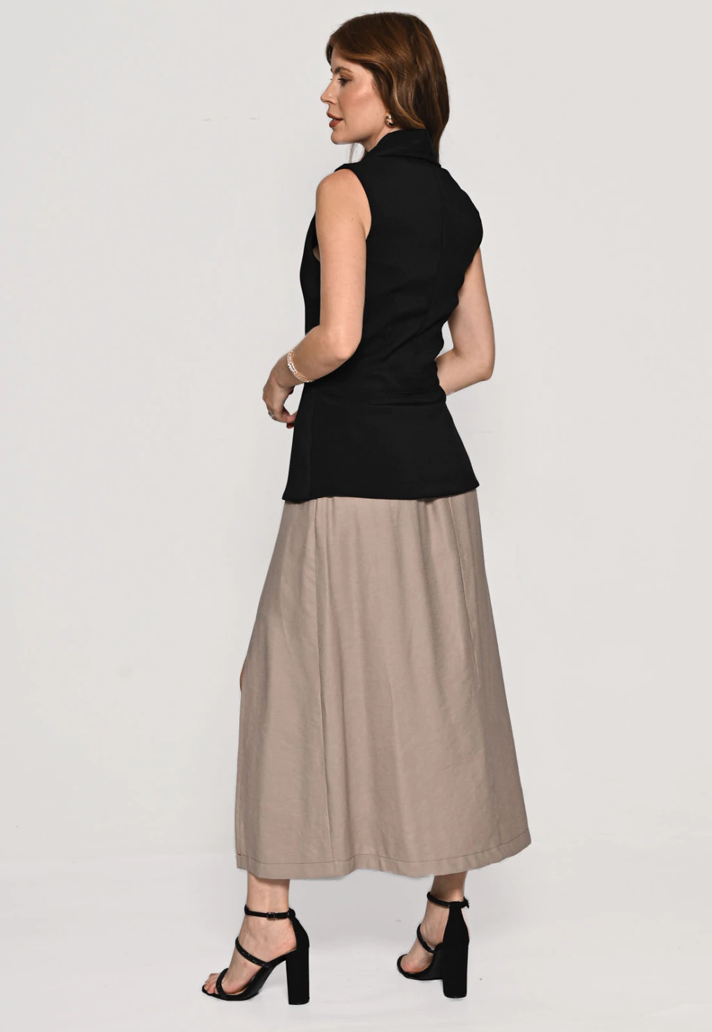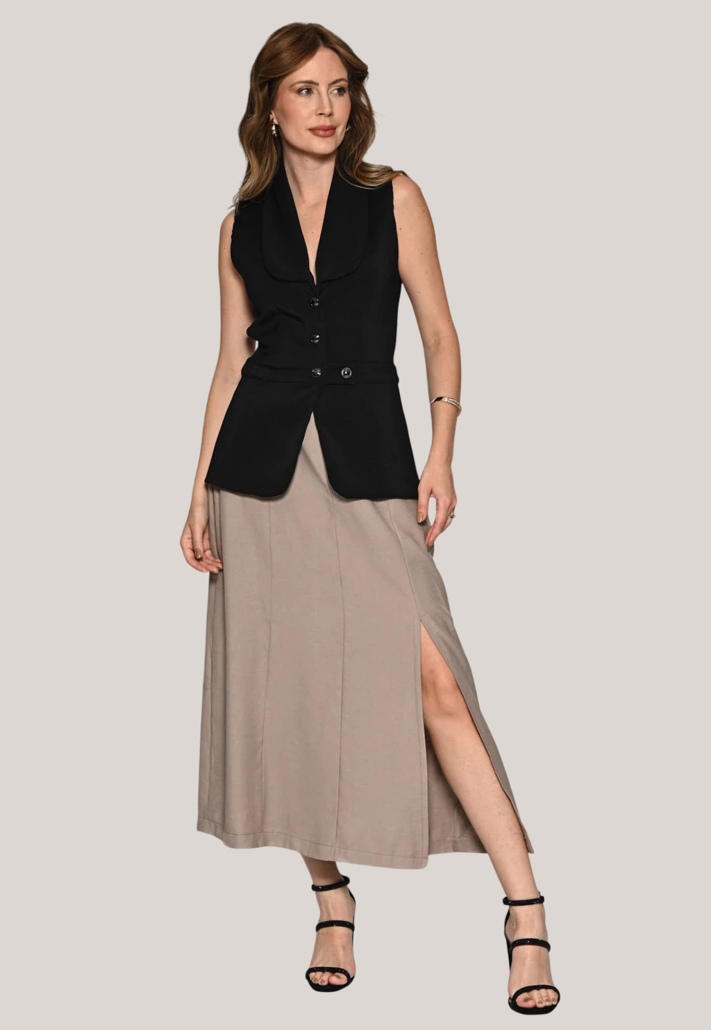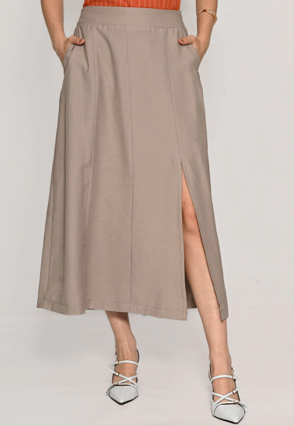 Saia Bisô Midi Alfaiataria Fenda Cinza. Peça confeccionada em alfaiataria com viscose na composição com fluidez. Saia com recortes e fenda frontal, zíper, cós limpo e elástico traseiro. Peça atemporal e moderna. Composição: 90% Viscose /10% Poliéster/ Forro: 100% Poliéster