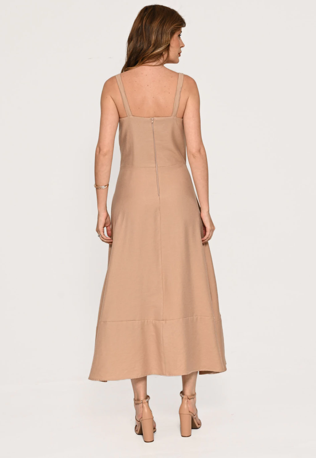 Vestido Bisô Alfaiataria Marrant Midi Liso Bege. Peça confeccionada em tecido marrant, alfaiataria com fluidez e toque macio. Vestido midi forrado com recortes bolsos laterais, alça larga modelo evasê. Composição: 90% Viscose/ 10% Poliéster/ Forro: 100% Poliéster