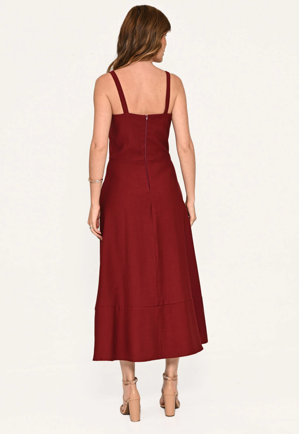 Vestido Bisô Alfaiataria Marrant Midi Liso Vinho. Peça confeccionada em tecido marrant, alfaiataria com fluidez e toque macio. Vestido midi forrado com recortes bolsos laterais, alça larga modelo evasê. Composição: 90% Viscose/ 10% Poliéster/ Forro: 100% Poliéster