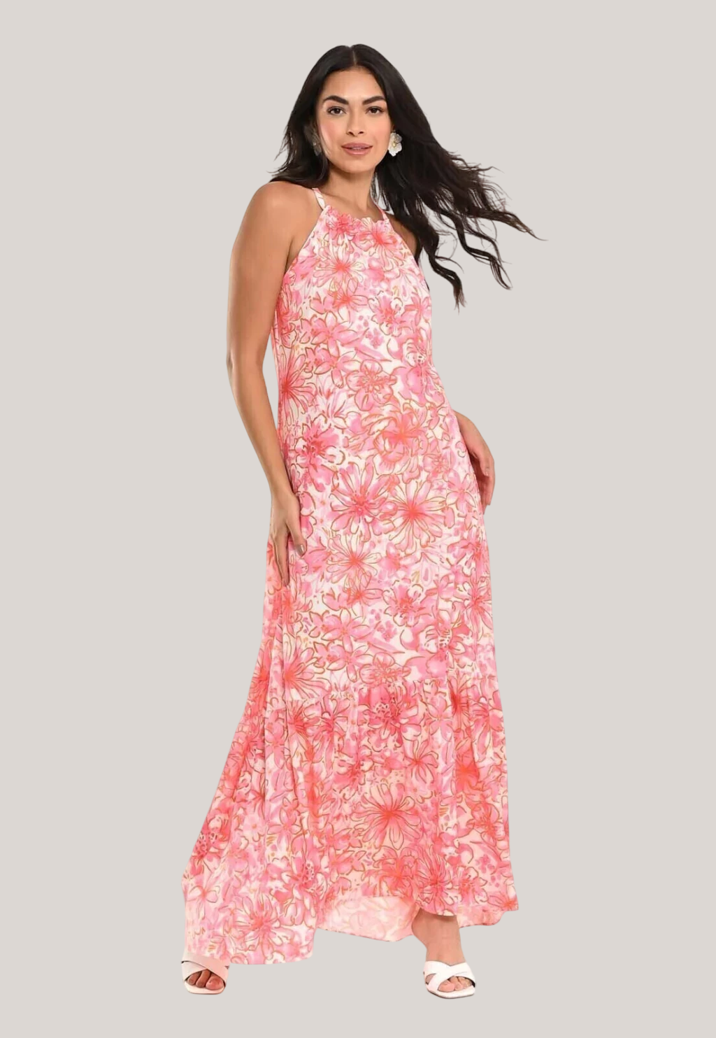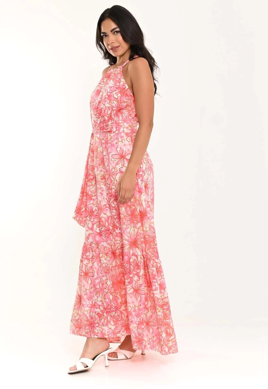 Vestido Bisô longo babado floral rosa. Peça confeccionada em crepe com estampa digital exclusiva com fluidez e maciez. Vestido é um luxo, com decote franzido no pescoço, cava americana, possui amarração. Modelo longo evasê, com recortes e babados, podendo ser usado solto ou com faixa do mesmo tecido que acompanha a peça ou outro cinto, forrado. Composição 96% Poliéster 04% Elastano / Forro: 100% Poliéster.