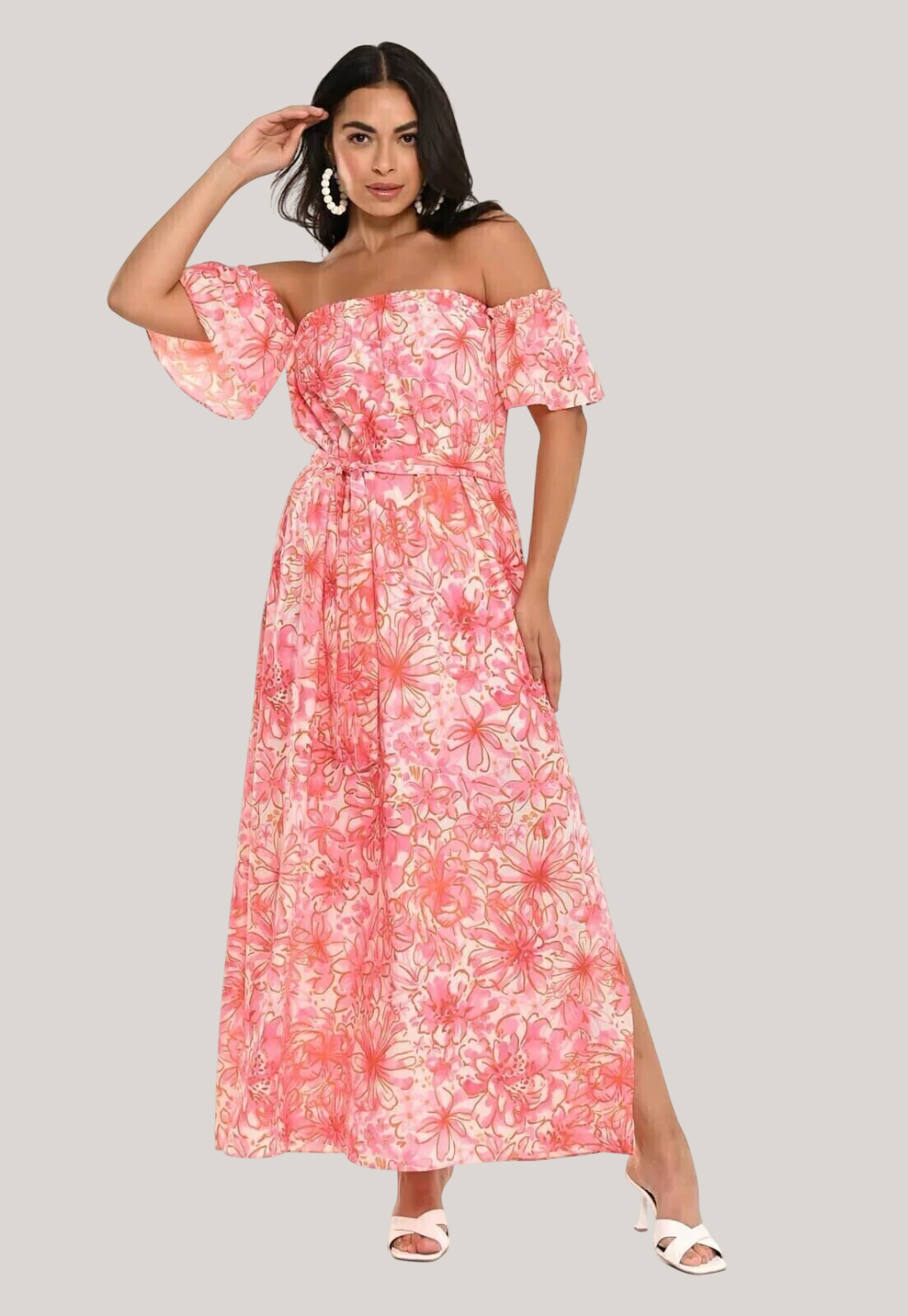 Vestido Bisô longo ciganinha floral rosa. Peça confeccionada em crepe com estampa digital exclusiva, tecido com fluidez e maciez, elástico no busto e nas mangas, modelo tomara-que-caia evasê com fendas laterias, forro acima do joelho, faixa para amarração. Peça linda com estilo romântico. Arrase nos acessórios. Composição: 96% Poliéster 04% Elastano.