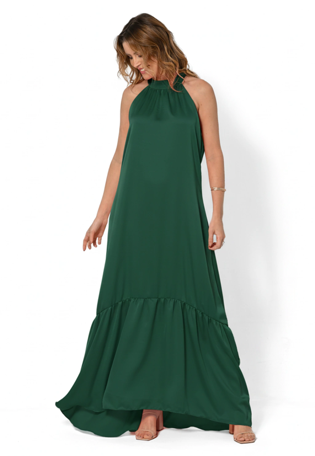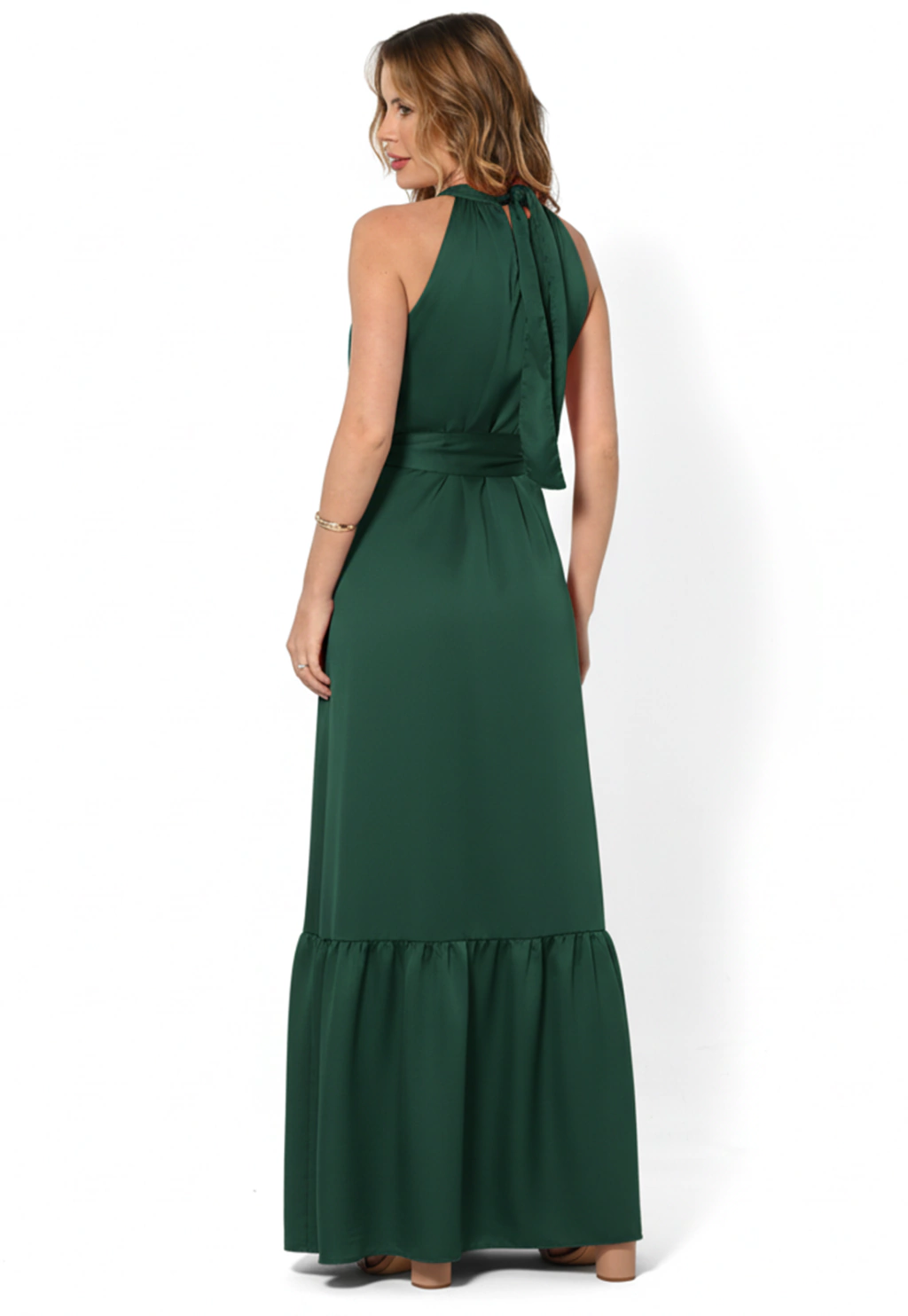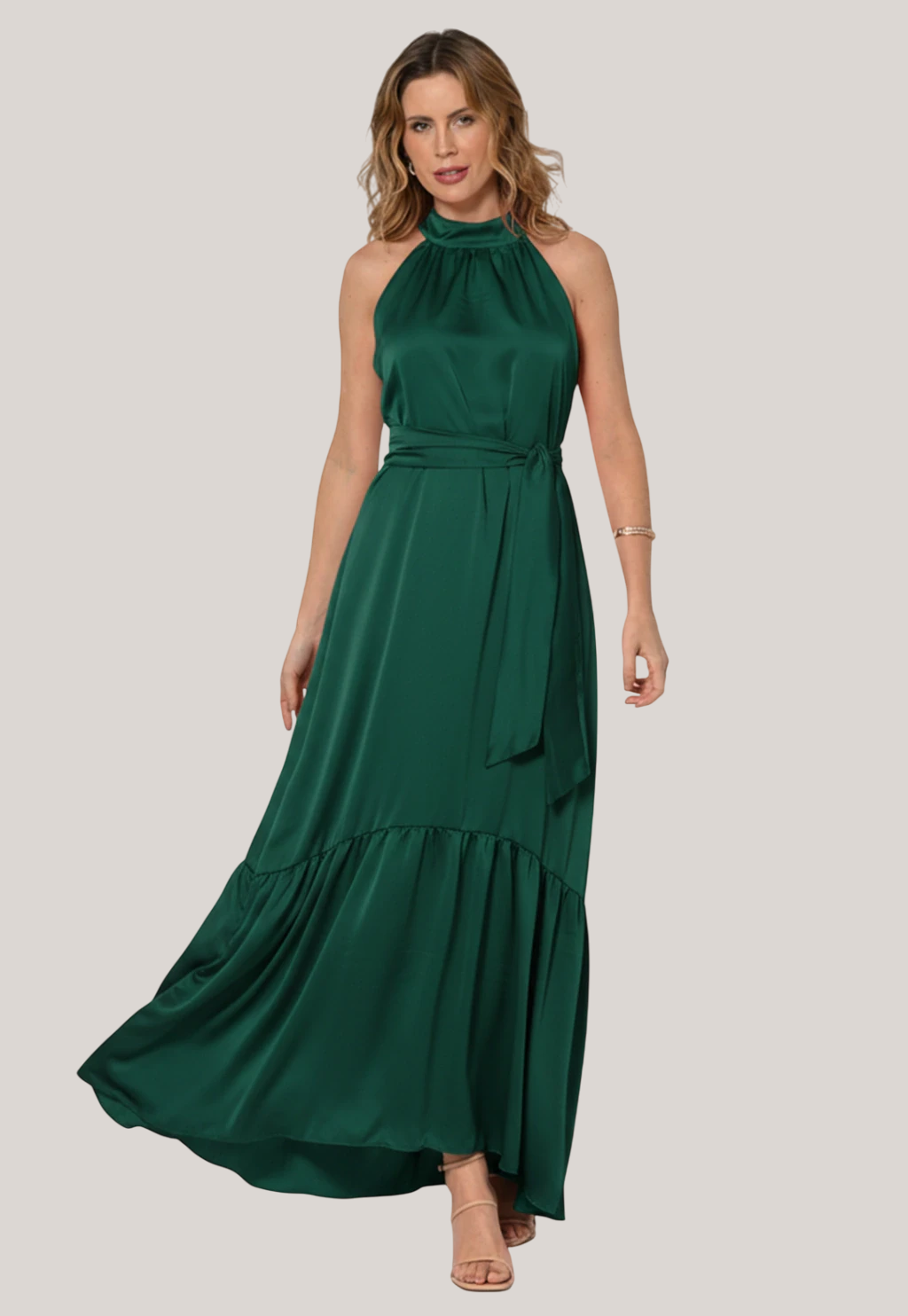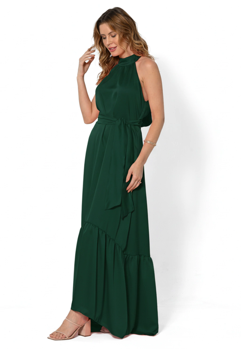 Vestido Bisô Longo Festa Liso Verde. Peça confeccionada cetim leve com toque macio e bastante fluidez. Vestido lindo forrado, cava americana, com amarração na gola para melhor ajuste, babado assimétrico e acompanha faixa para cintura. Composição: 100% Poliéster