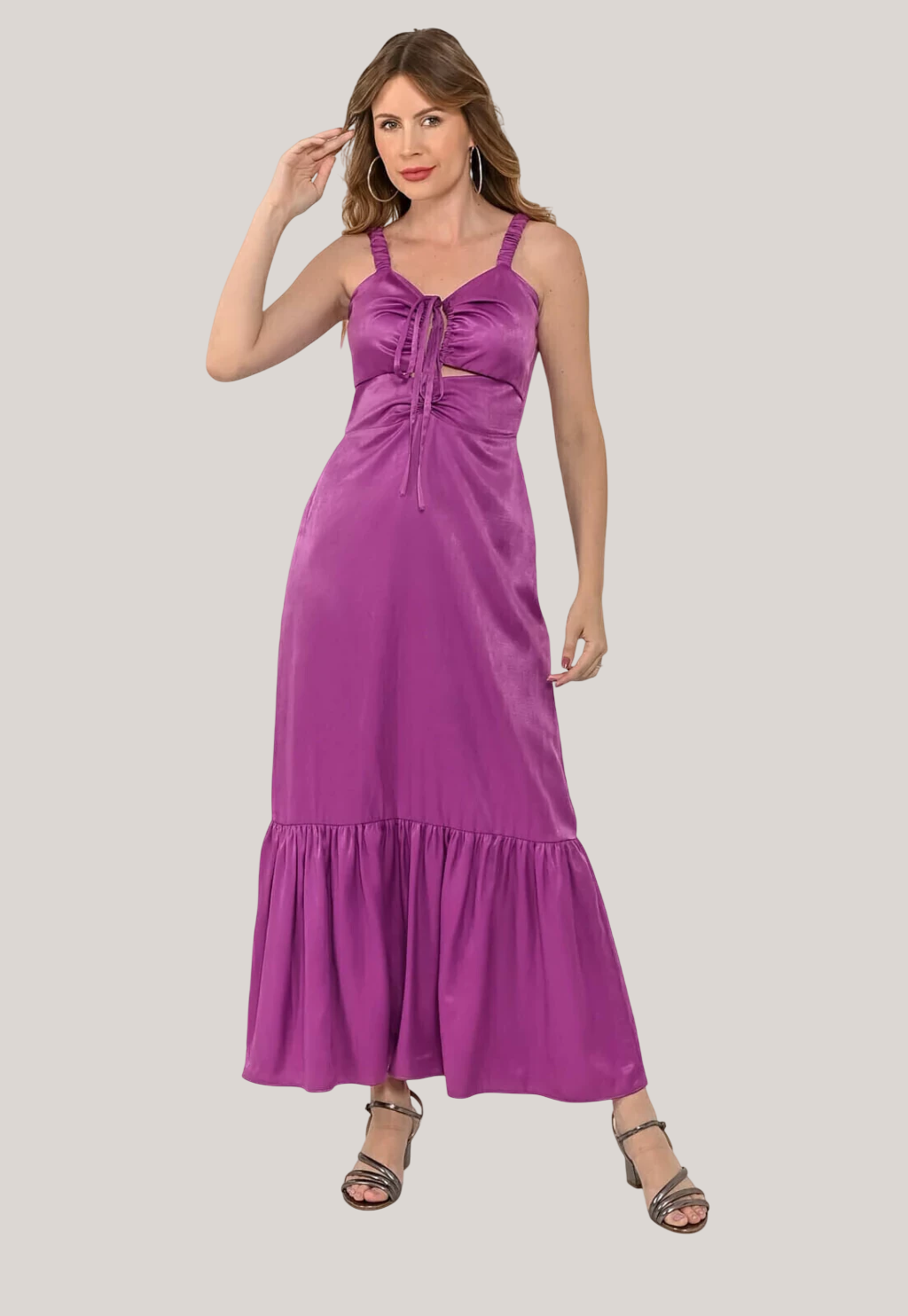 Vestido Bisô Longuete Liso Fúcsia. Peça confeccionada em viscose com toque macio e com leve brilho acetinado. Vestido forrado, com elástico na alça para melhor ajuste, busto com amarração para regulagem, recortes estratégicos, comprimento longuete com leve babado. Composição:50% Poliéster 50% Viscose