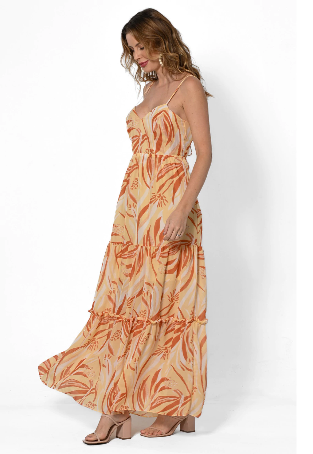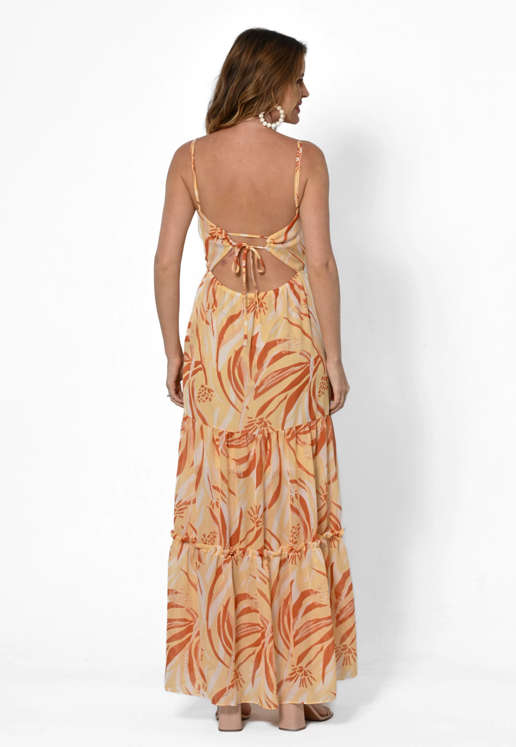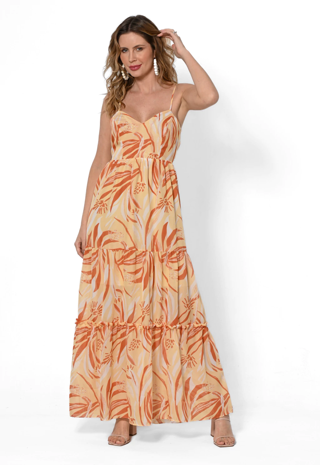 Vestido Bisô Marias Estampado Amarelo. Peça confeccionada crepe chifon com bastante fluidez. Vestido lindo forrado, com babados (marias), alças reguláveis, decote V, costas com amarração para regulagem.