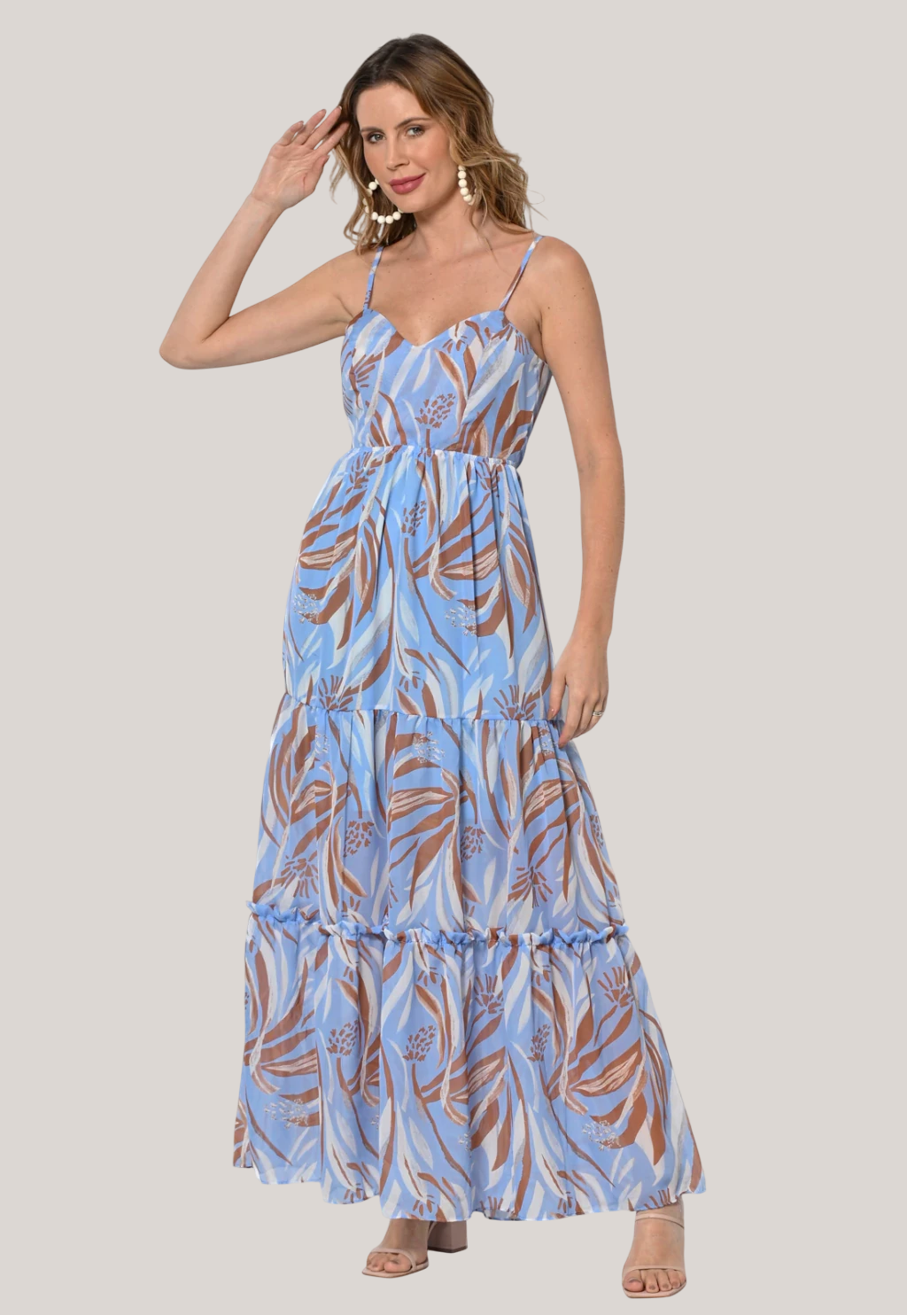 Vestido Bisô Marias Estampado Azul. Peça confeccionada crepe chifon com bastante fluidez. Vestido lindo forrado, com babados (marias), alças reguláveis, decote V, costas com amarração para regulagem.