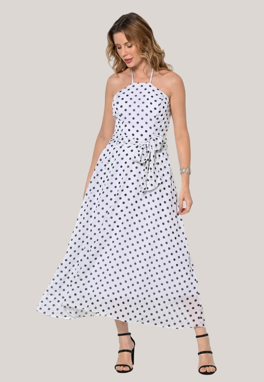 Vestido Bisô Midi Lastex Poá Branco. Peça confeccionada crepe chifon estampa em poá que está super alta, com bastante fluidez. Vestido lindo forrado, modelo evasê decote frente única com lastex e alça com amarração, acompanha faixa para cintura (opcional). Composição: 100% Poliéster