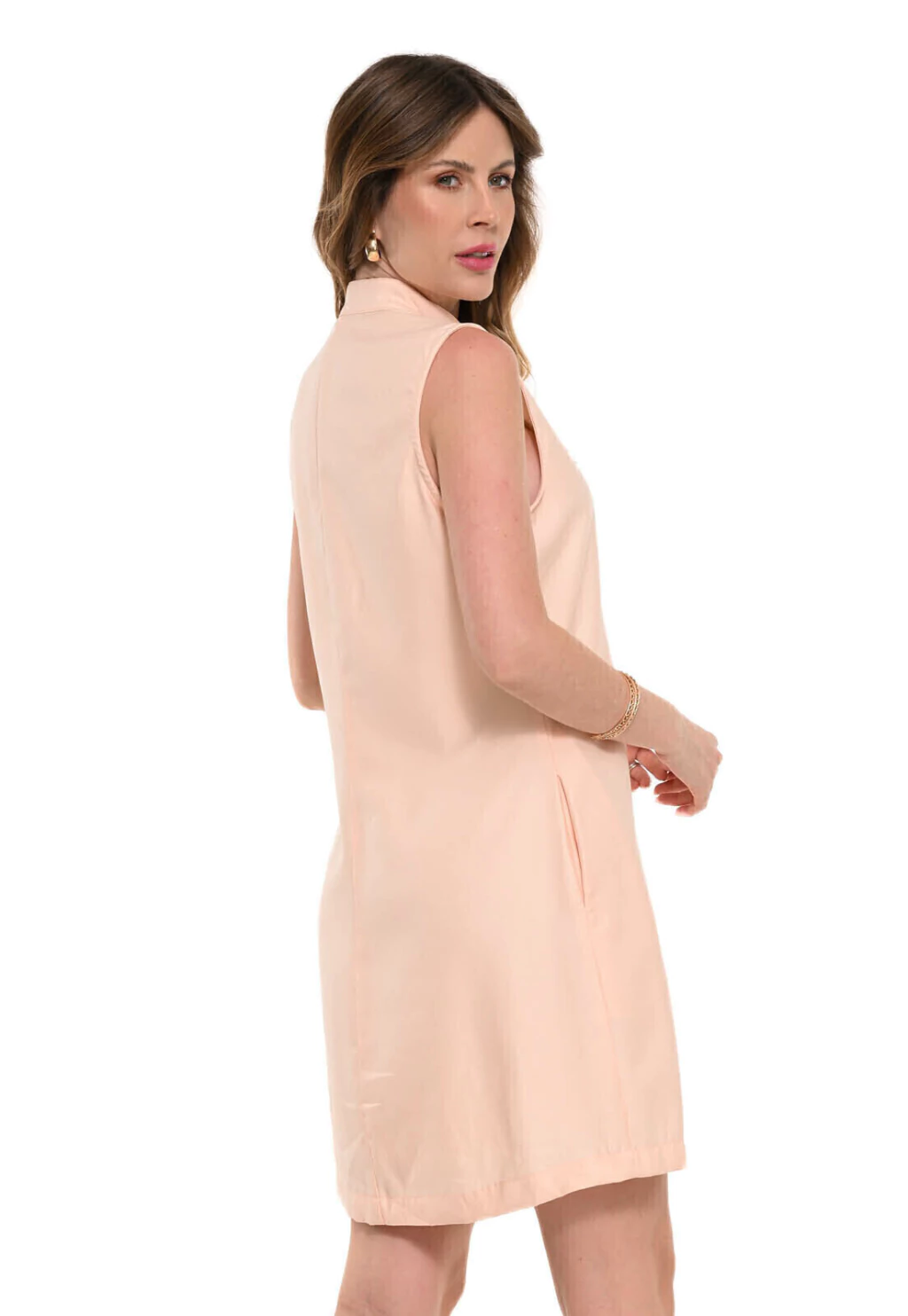 Vestido Bisô Chemise curto botões salmão. Peça confeccionada em alfaiataria com toque macio, vestido forrado gola padre com botões para fechamento, bolsos laterias, manga curta, peça atemporal e moderna. Composição: 90% Viscose 10% Poliéster/ Forro: 100% Poliéster.