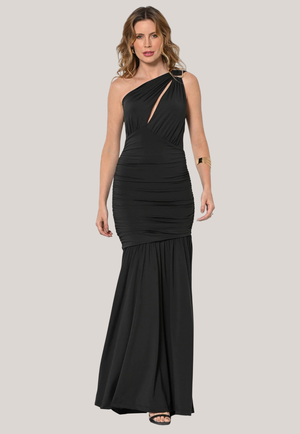 Vestido Bisô Jersey Longo Com Fivela Preto. Peça confeccionada em malha jersey com excelente fluidez, elasticidade e toque macio. Vestido todo forrado do mesmo tecido, ombro só com fivela, com drapeados na cintura e quadril, possui recorte estratégico no busto. Peça linda, chique e moderna pra você arrasar em seu evento. Composição: 90% Poliéster/ 10% Elastano