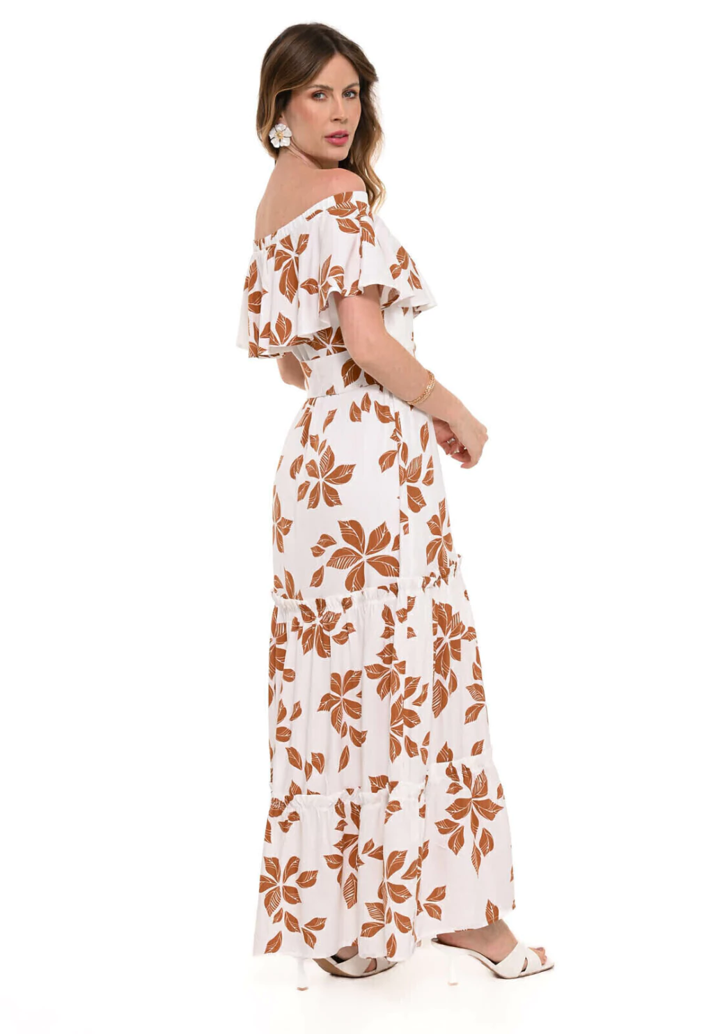 Vestido Bisô longo estampado marias off white. Peça confeccionada em crepe com estampa digital com toque macio e fluidez. Vestido ombro a ombro com babados, forrado, possui zíper lateral, camadas em babados (marias), acompanha faixa para amarração. Composição: 96% Poliéster 04% Elastano/ Forro: 100% Poliéster.