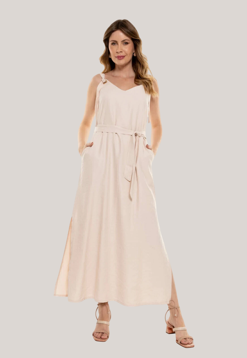 Vestido Bisô longo ilhós liso bege. Peça confeccionada em tecido plano sensoriale com viscose na composição, toque macio e fluidez. Vestido com modelagem ampla, bolsos e fendas laterais, com faixa opcional para amarração, alças com regulagem nos ilhós dourados. Peça forrada. Composição: 90% Viscose/ 10% Poliéster/ Forro: 100% Poliéster