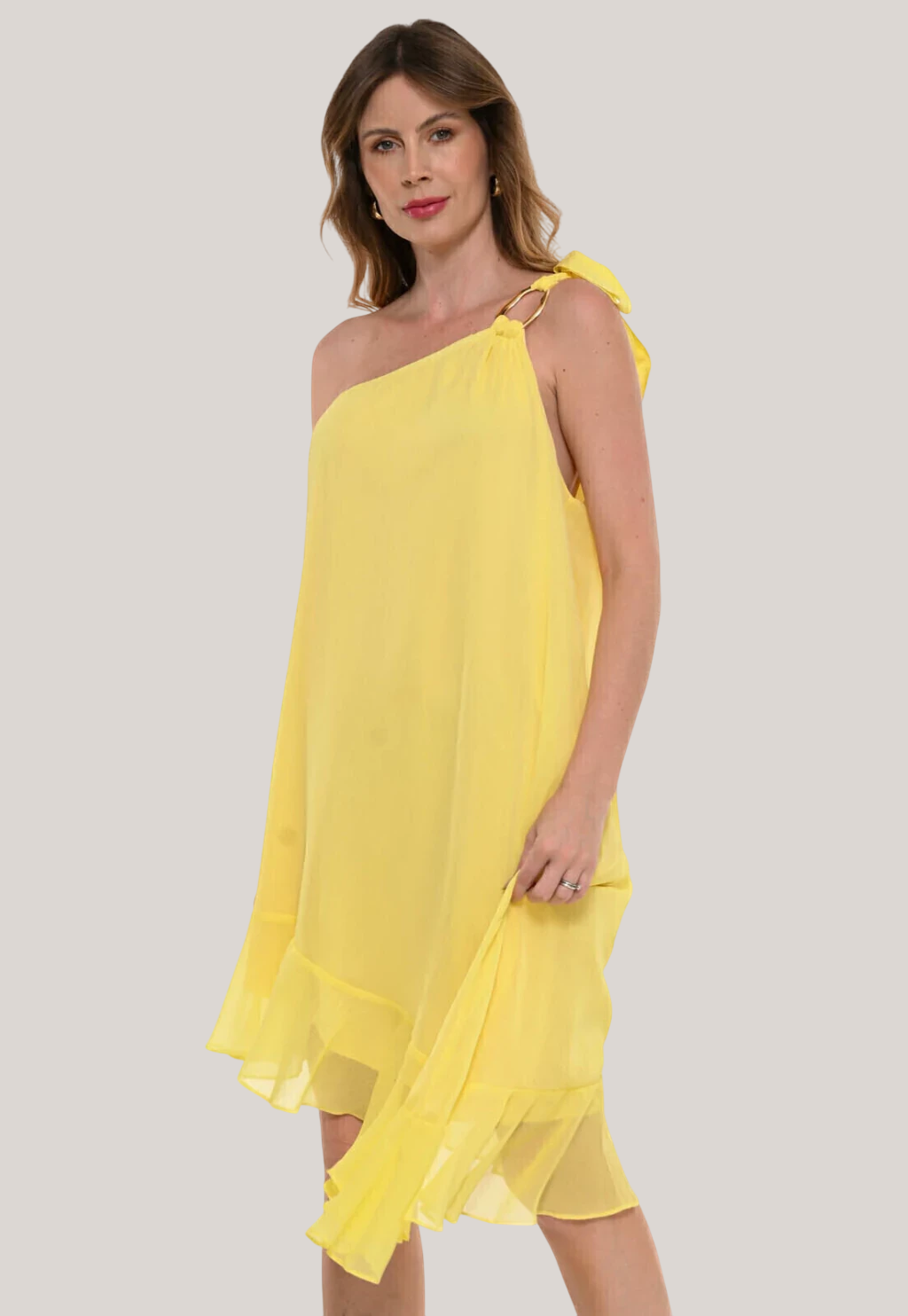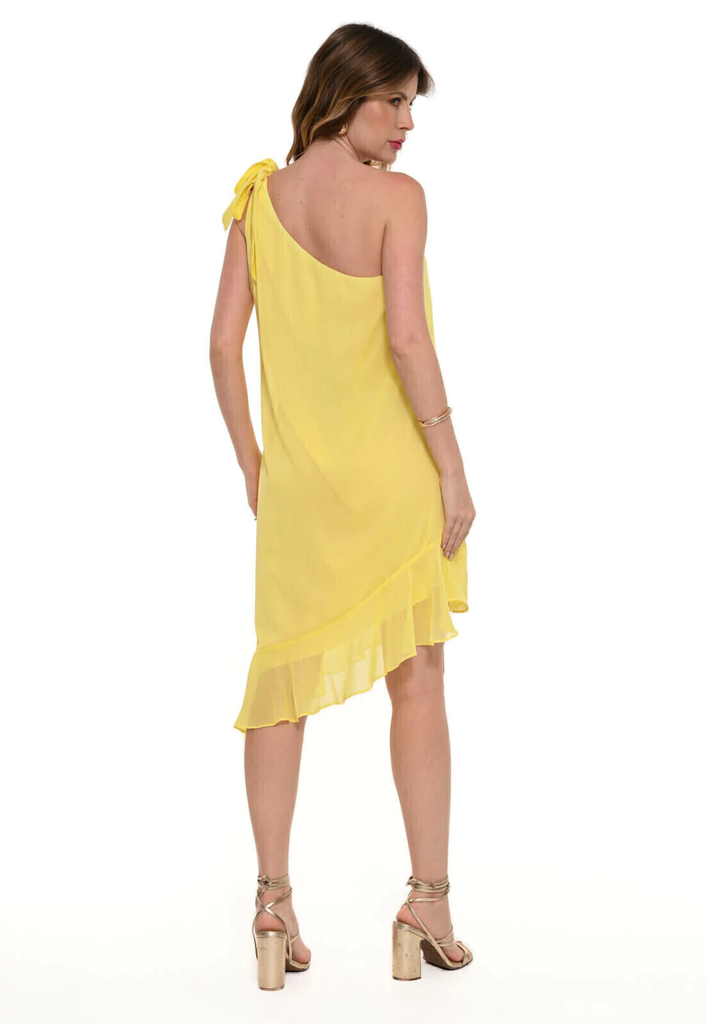 Vestido Bisô curto assimétrico chifon amarelo. Peça confeccionada em crepe chifon com leve textura, forrado, decote e babados assimétricos, com detalhe de fivela na amarração. Vestido lindo para aquela ocasião especial. Composição: 100% Poliéster/ forro: 100% Poliéster.