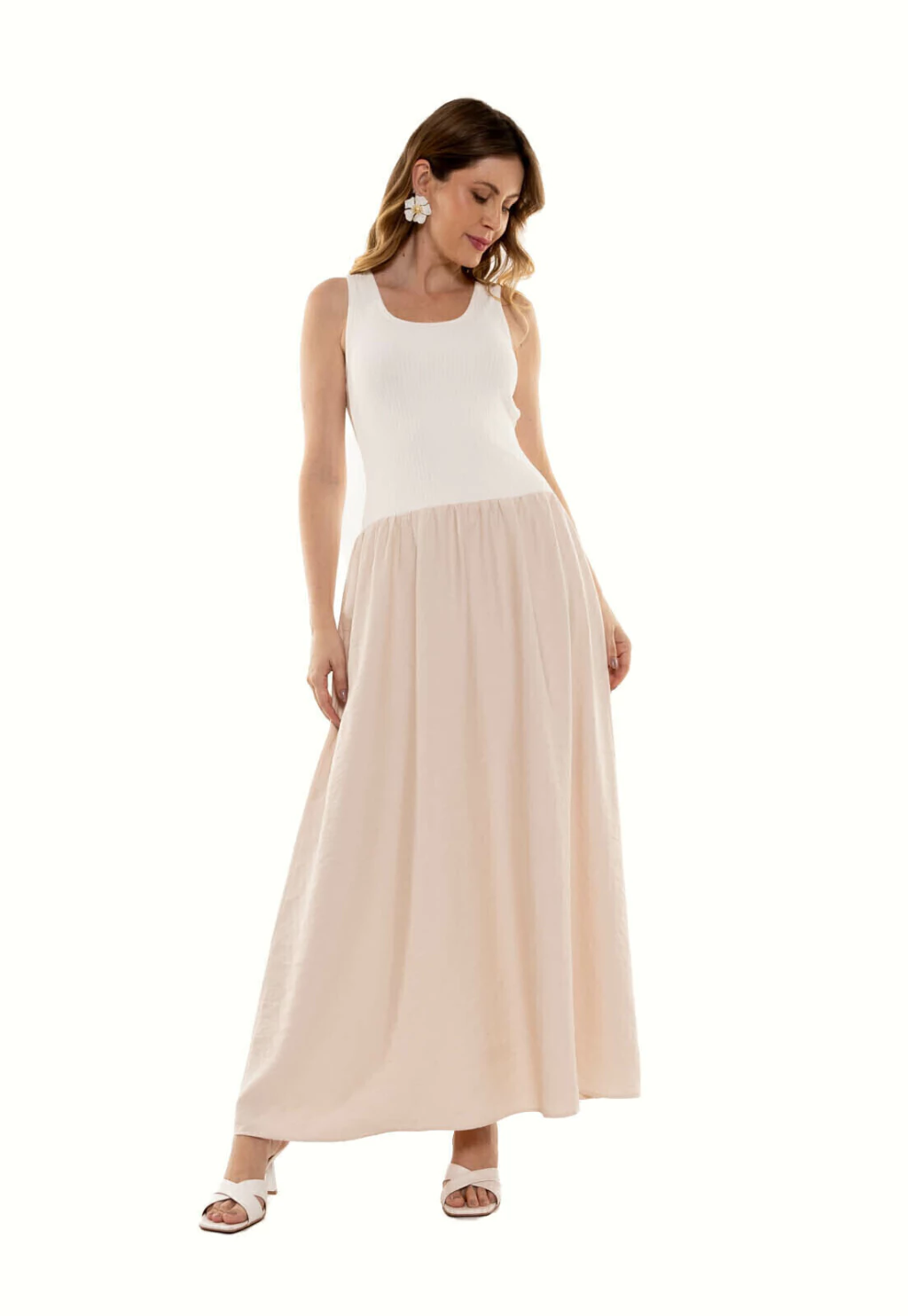 Vestido Bisô duo longo off white/ areia. Peça confeccionada em dois tecidos. Parte de cima em malha canelada dupla, alça regata, saia longa com cós deslocado tecido plano com fluidez, peça atemporal e moderna. Composição: Blusa: 90% Elastano/10% Viscose/ Saia: 90% Viscose/ 10% Poliéster/ Forro 100% Poliéster