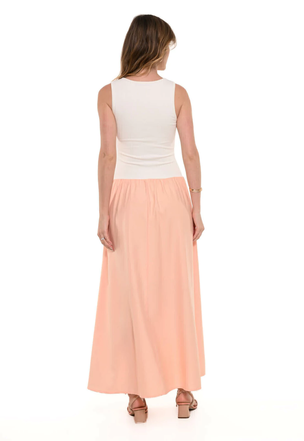 Vestido Bisô duo longo off white/ salmão. Peça confeccionada em dois tecidos. Parte de cima em malha canelada dupla, alça regata, saia longa com cós deslocado tecido plano com fluidez, peça atemporal e moderna. Composição: Blusa: 90% Elastano/10% Viscose/ Saia: 90% Viscose/ 10% Poliéster/ Forro 100% Poliéster